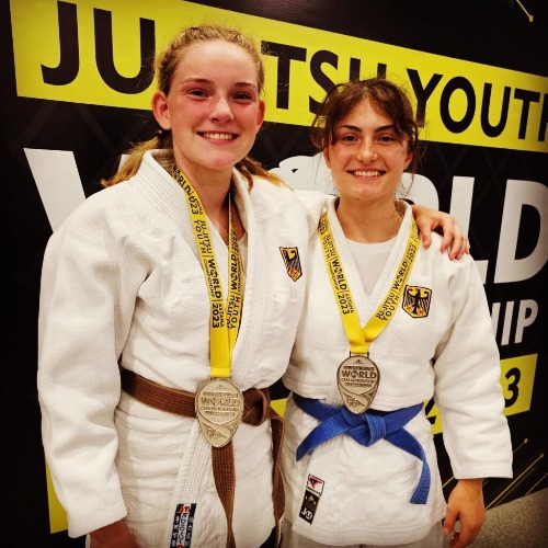 Vizeweltmeisterinnen! Jule (Fighting U18 weiblich bis 57 kg) und Michelle (Fighting U21 weiblich bis 57 kg) erkämpfen sich bei den Junioren-Weltmeisterschaften im Ju-Jutsu in Astana (Kasachstan) beide die Silbermedaille! Herzlichen Glückwunsch zu diesem hochverdienten Erfolg!