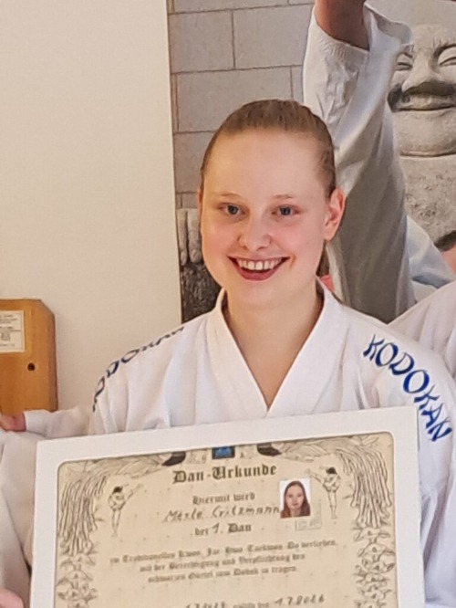 Mit besonderem Stolz erfüllt sind wir über die erfolgreiche Prüfung von Merle zum 1. DAN! Merle ist seit Anfang an dabei und hat all die Jahre beharrlich trainiert und an sich gearbeitet. Du bist ein echtes Vorbild für uns alle, Merle!